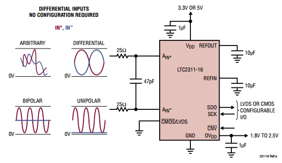 LTC2311-16 является старшим представителем семейства совместимых по выводам 16-, 14- и 12-разрядных АЦП последовательного приближения с частотой дискретизации 5 и 2 MSPS (млн. выборок в секунду). Устройства содержат высокоточный источник опорного напряжения с малым температурным дрейфом, составляющим 20 мкВ/°C. Все АЦП семейства работают от источника питания напряжением 3.3 В или 5 В, при этом потребляемая мощность составляет 30 мВт для 3.3 В и 50 мВт для 5 В. Простая интеграция преобразователя в систему возможна за счёт наличия высокоскоростного SPI-совместимого интерфейса ввода-вывода с логическими уровнями КМОП и LVDS.